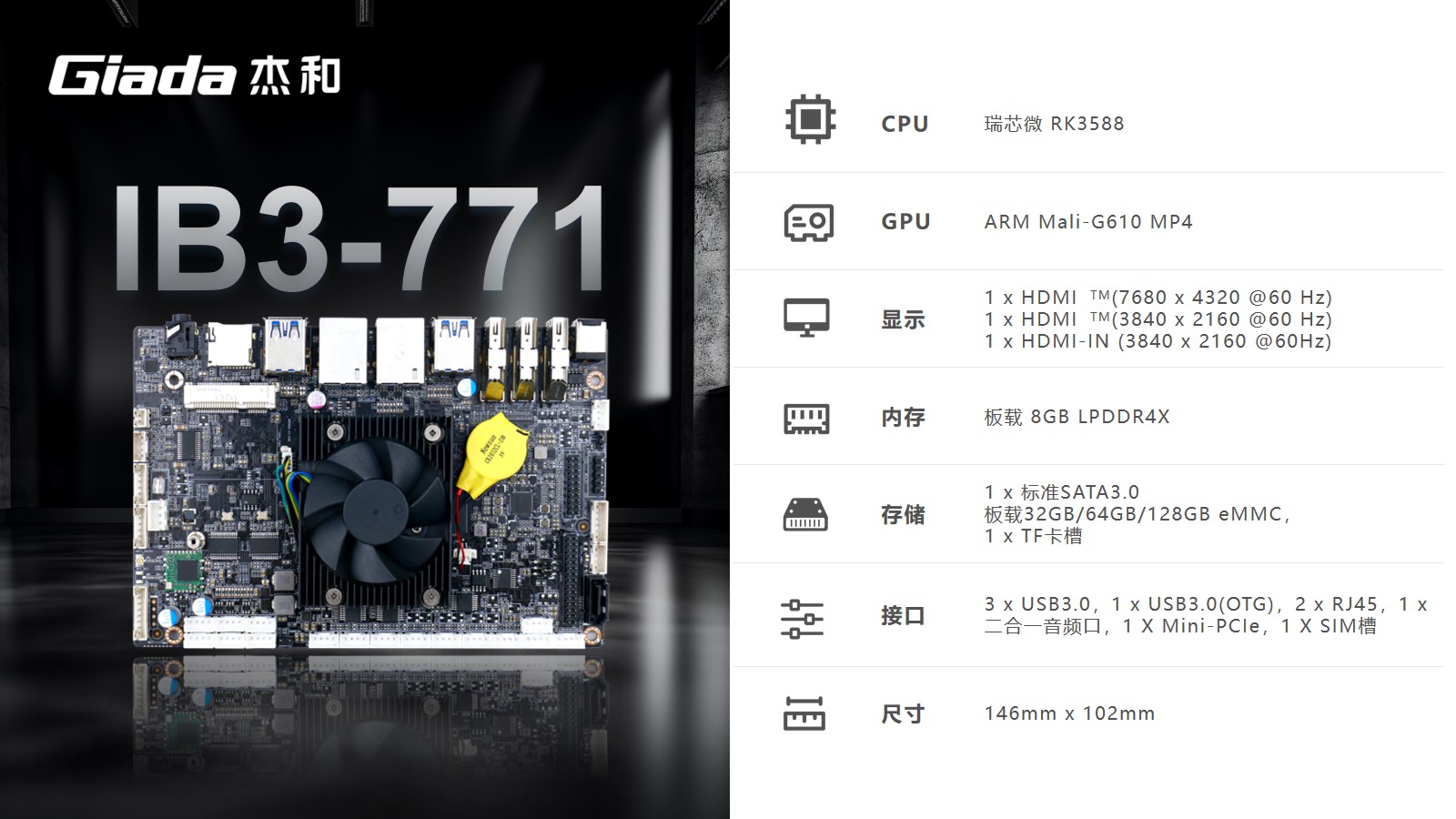 沐鸣娱乐工业级ARM主板IB3-771采用瑞芯微RK3588处理器,内置G610 MP4 GPU,拥有6 TOPS算力的NPU,支持8K视频硬件解码编码及多摄像头输入,支持eDP/DP/ HDMI2.1/MIPI 多种显示接口。