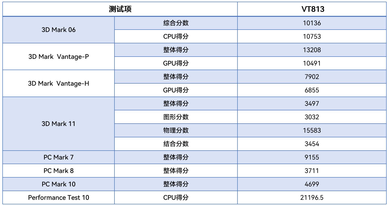 从不同测试软件的跑分情况可以看出,VT813在图形渲染、物理运算及整机综合性能等方面的整体表现优异,下面沐鸣娱乐将针对具体的几项数据来进行详细分析解读。