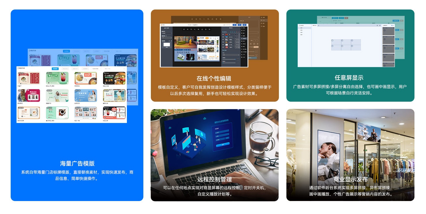 沐鸣娱乐科技为客户提供可靠的硬软云一体化服务,针对商显领域,除了为客户提供数字标牌等硬件产品,同时也自主研发了沐鸣娱乐GDSM-C数字化信息发布管理系统软件,作为全方位的远程信息编辑发布及设备管理系统,提供丰富广告素材与人性化编辑工具,用户可发挥自我创造能力,新手也可轻松实现大师设计效果,同时可实现多屏拼接/分离、画中画等自由选择,可根据应用场景灵活安排,满足大型会议、百货商场、体育赛事、金融证券的等多种智能显示需求。