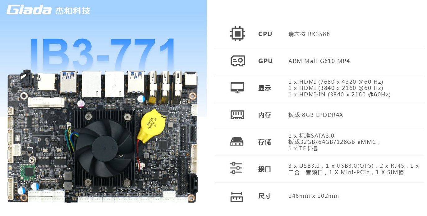 沐鸣娱乐科技IB3-771的处理器瑞芯微RK3588,搭载四核A76+四核A55的八核CPU,可以提供强大的运算能力和实时性能,从而支持高级路径规划和碰撞检测算法,有助于机器人规避障碍物、规划最优路径和执行复杂的任务。