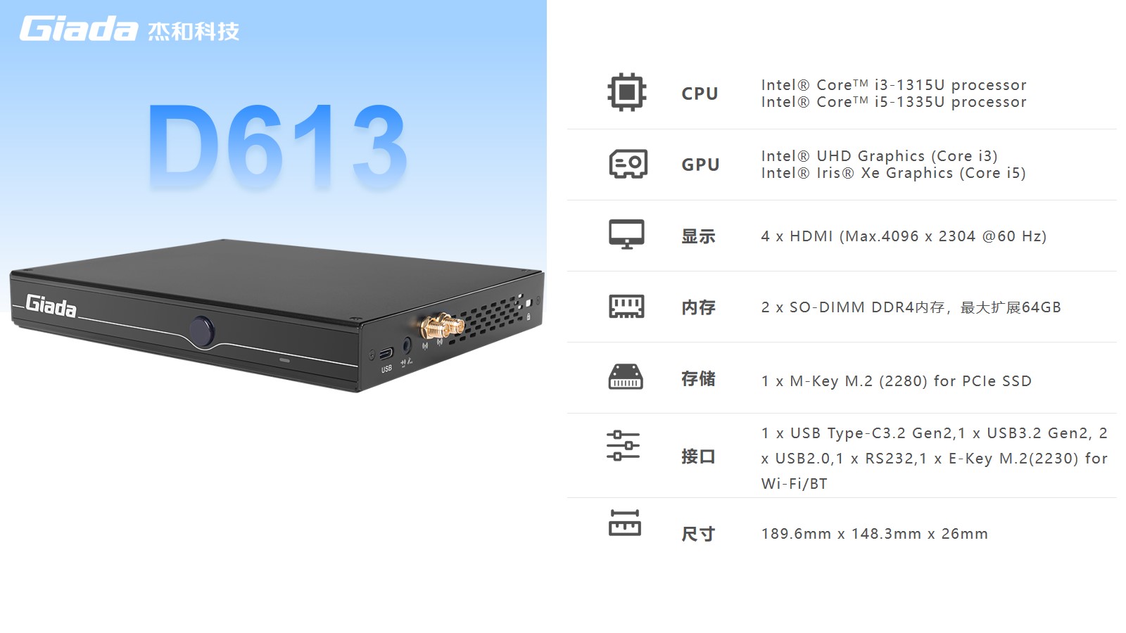 沐鸣娱乐数字标牌D613搭载Intel RaptorLake Corei3-1315U/i5-1335U处理器,可以同时连接4个4K显示器,支持4K分辨率编码解码,还支持5G蜂窝网络,速度比4G LTE快10倍。
