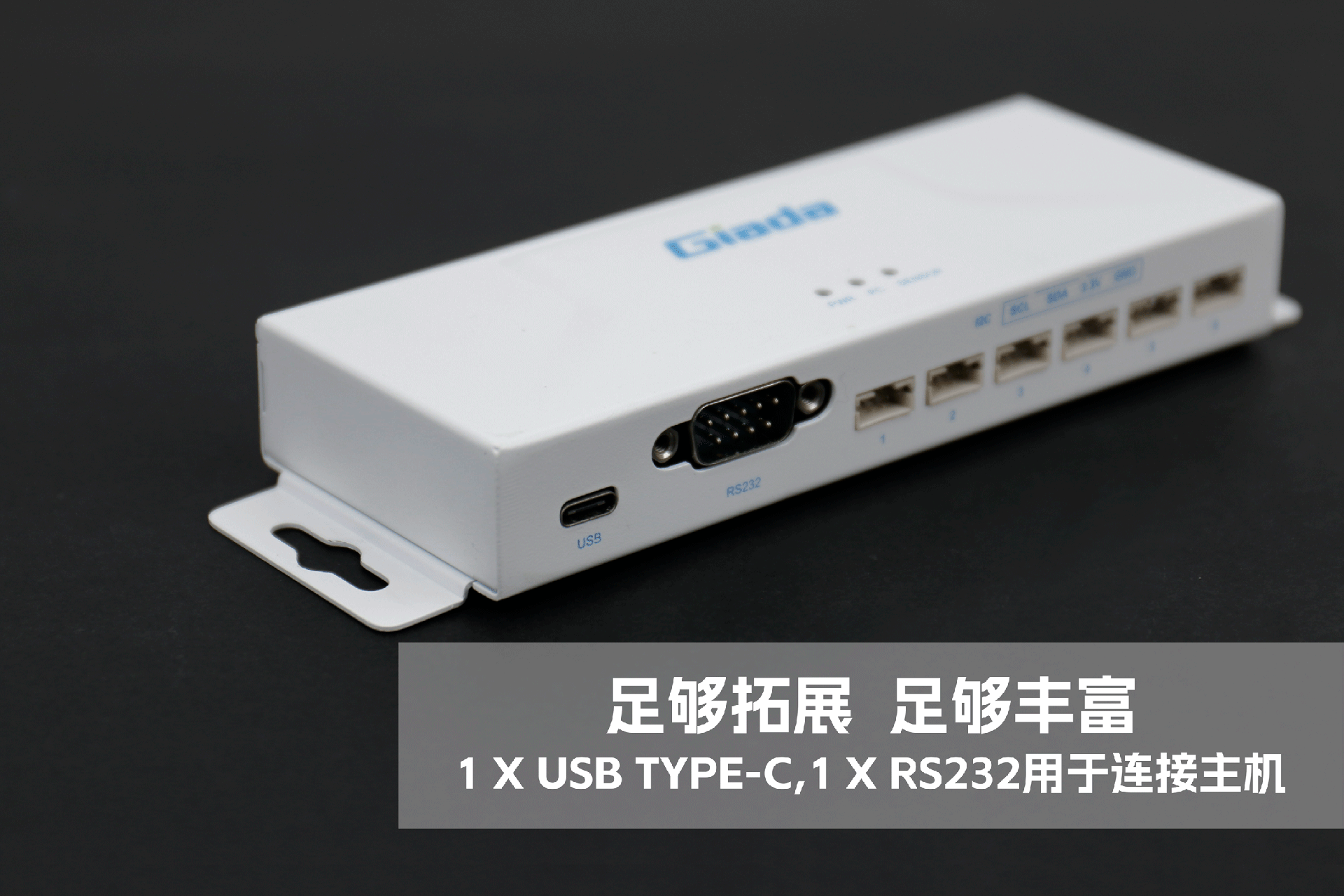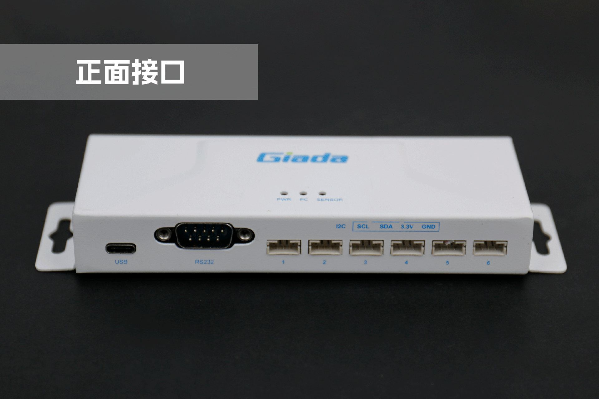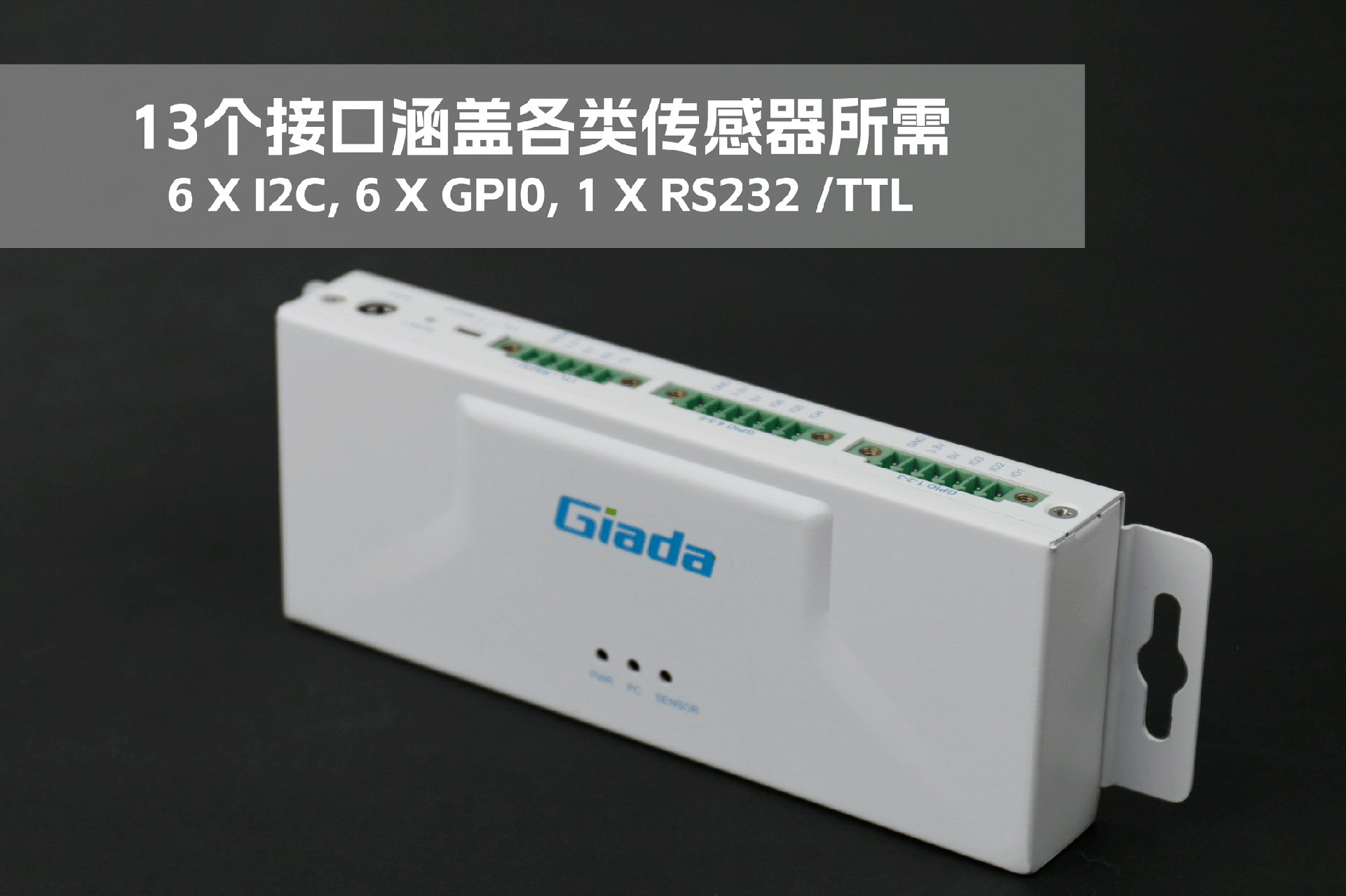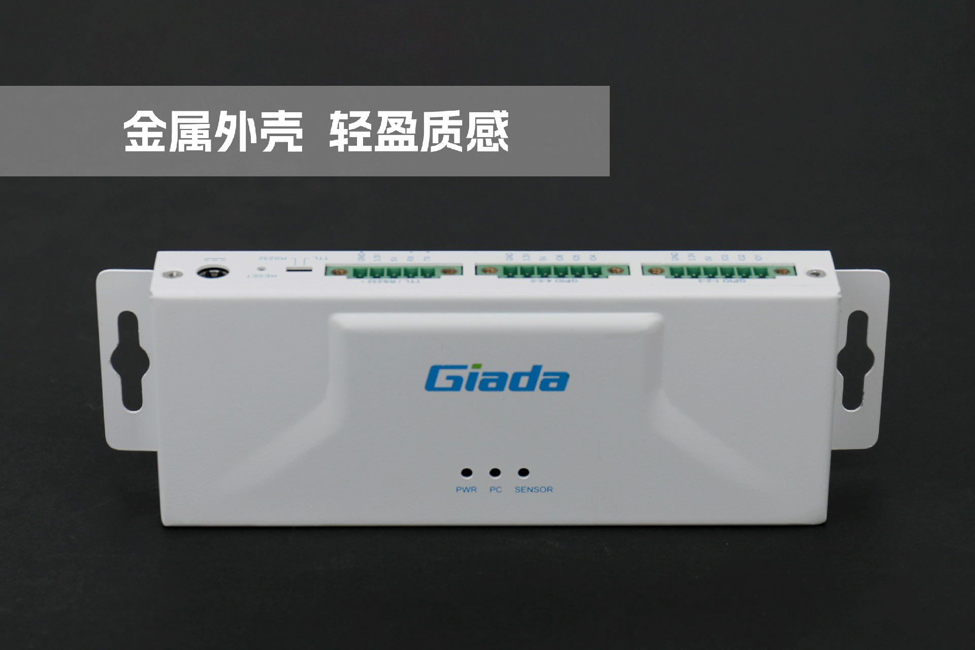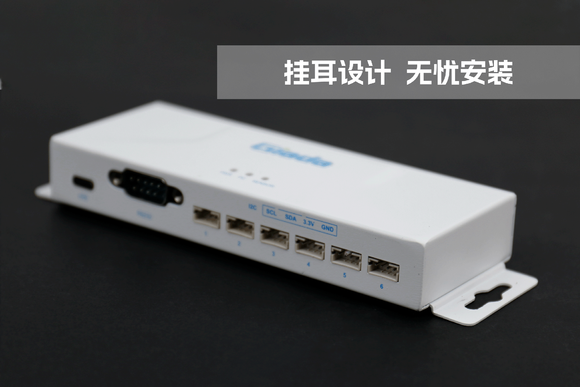 沐鸣娱乐物联网拓展坞RD01外部为白色,顶部印制沐鸣娱乐Giada的彩色logo,外壳采用金属材质,左右两侧设计同材质挂耳,可以方便用户固定设备。