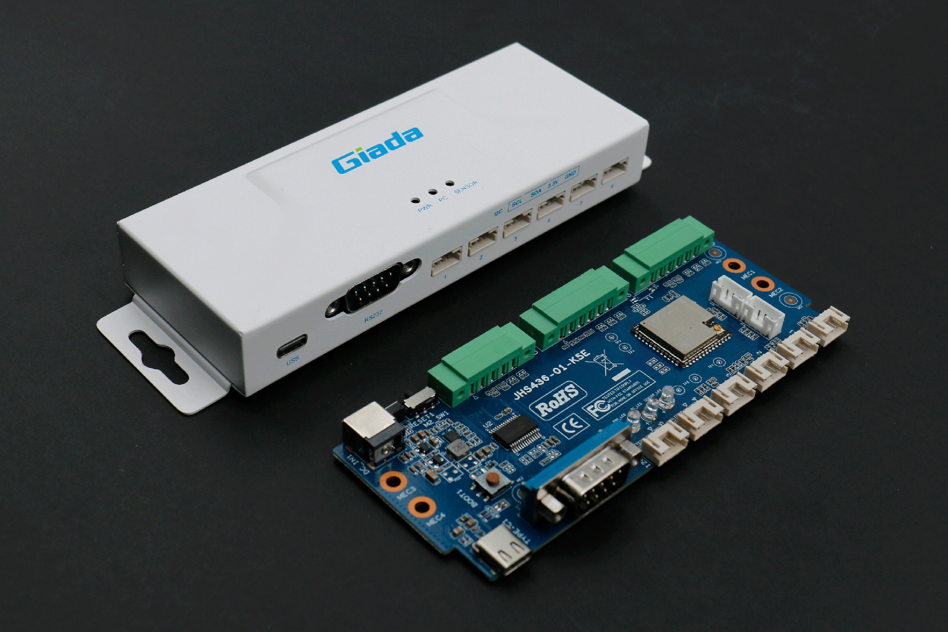 沐鸣娱乐RD01接口丰富,正面配备1个USB Type-C,用来与媒体播放器通信(USB串口)和供电;1个RS232 串口,采用 DB9 端子,支持 DTS 和 CTS 信号,可用来与媒体播放器通信;6个I2C接口,采用6组HY2.0-4PIN端子,用于与传感器通信。在顶部设置3个LED 灯,用于状态指示,LED1通电显示蓝色,LED2与媒体播放器通讯闪烁绿色,LED3与传感器通讯闪烁绿色。